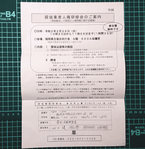 2020年度 福岡県警・福岡県同和対策局-探偵業研修会の案内到着