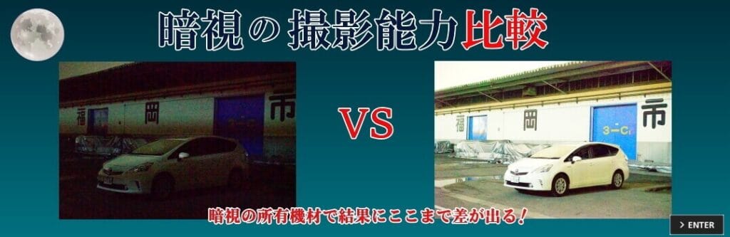 当探偵事務所が所在する福岡市は、比較的、どの場所も明るく、暗視の専用のカメラが無くても、問題なく撮影出来るカメラを通常使用しています。