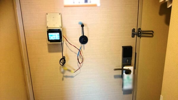 リバースドア(アパートやマンションの扉に装備されるレンズ付きの覗き穴)の穴を利用して、設置します。